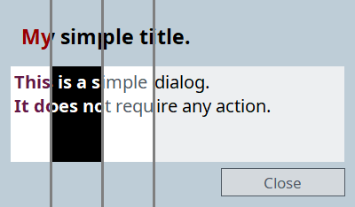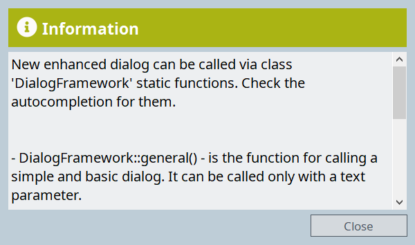 The simple dialog is the most basic application of the dialog panels. It shows a text and can be changed with the function general().