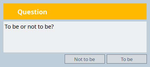 The question dialog is the last direct variation of the general dialog panel. This dialog adds a second button and different header style. It is edited with question().