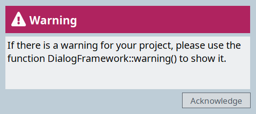 The warning dialog is another variation of the general dialog panel. The default values are set to generate a warning with icon and attention-grabbing header, as well as specifying an "acknowledge" button. The warning() function is used to adjust this dialog.