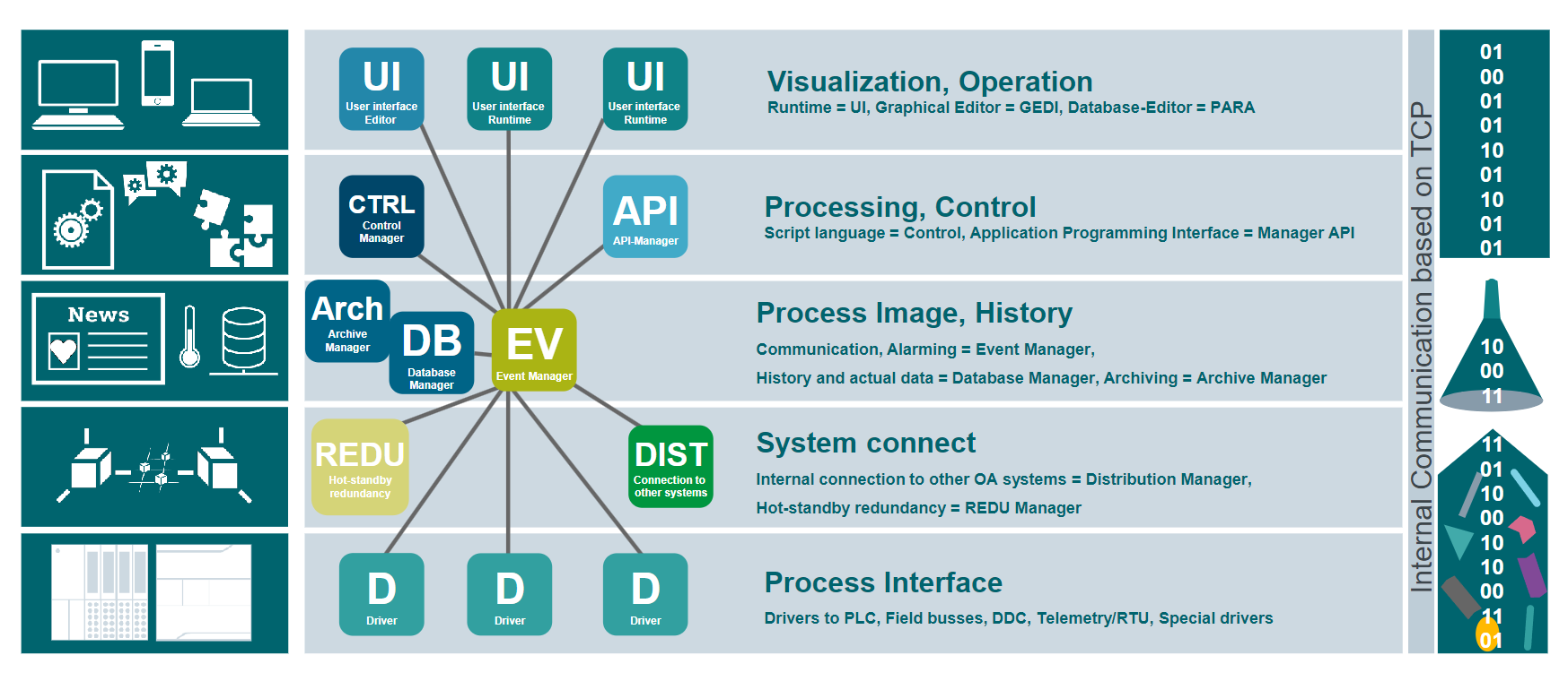 WinCC OA is a modularly built system. The required functionalities are handled by specificunits that were created for different tasks. In WinCC OA these units are called managers - the managers are own software processes.