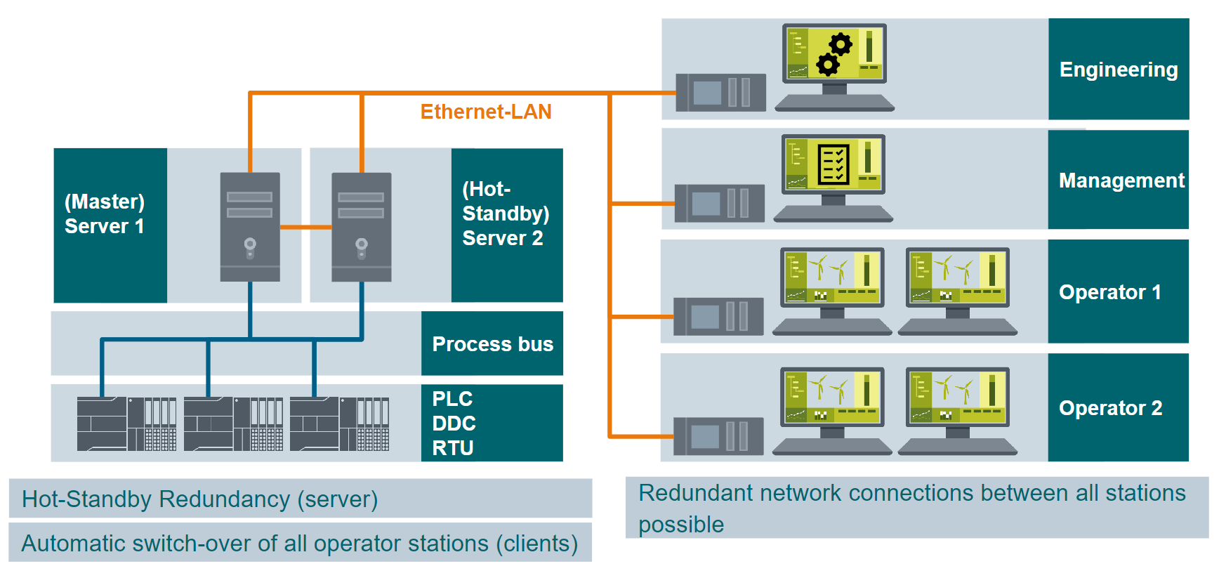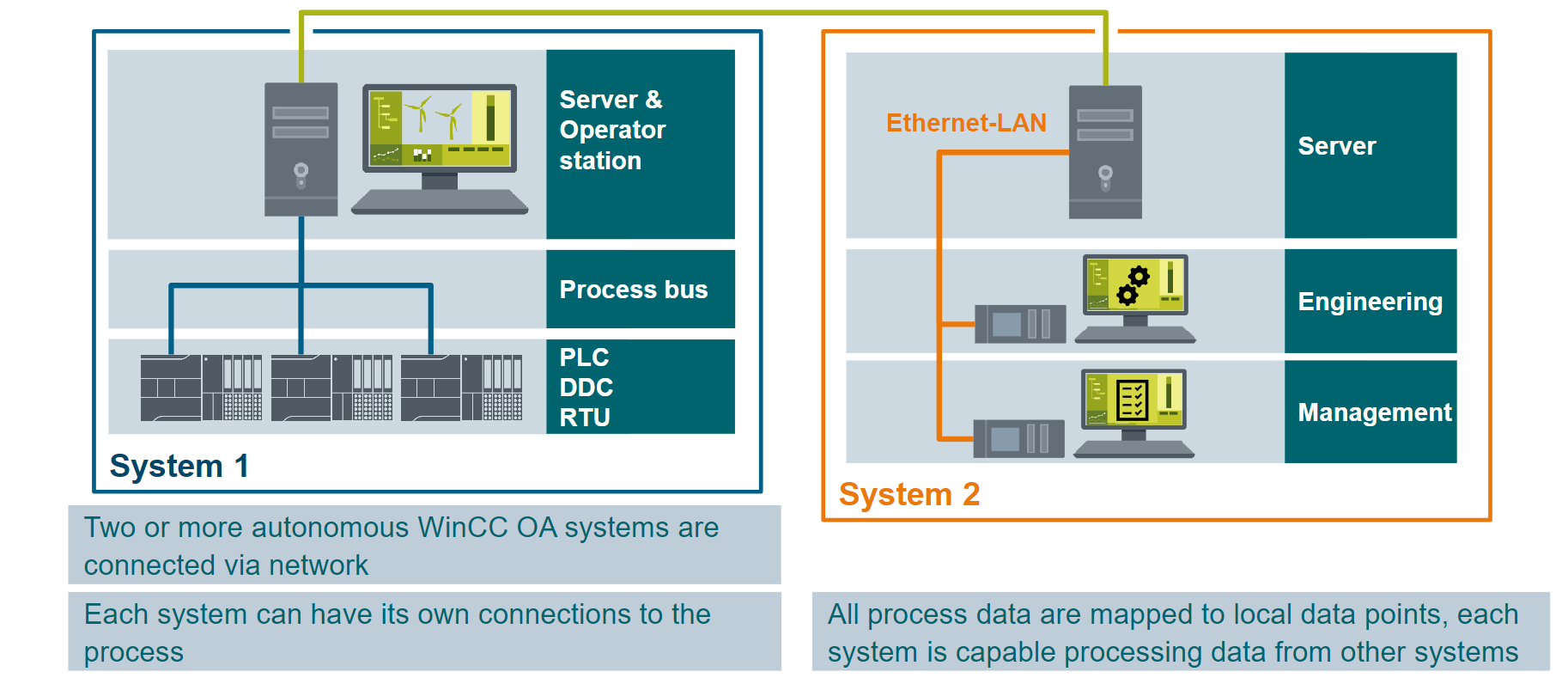 WinCC OA provides the possibility to run all server processes as hot-standby redundancy on two computers (see also online help under Redundancy, basics). It's also possible to combine several autonomous systems into an overall system (multi server architecture/ distributed system ) in WinCC OA (see chapter Distributed systems, basics). These more complex configurations are, however, not a part of this getting started manual.