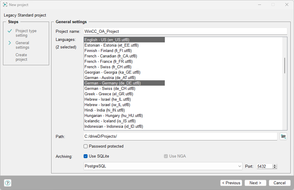 In order to create a project for multilingual user interfaces, you have to press the [CTRL] key to select further languages. Later you can define individual texts and fonts for the user interfaces of the workstations (multilingualism).