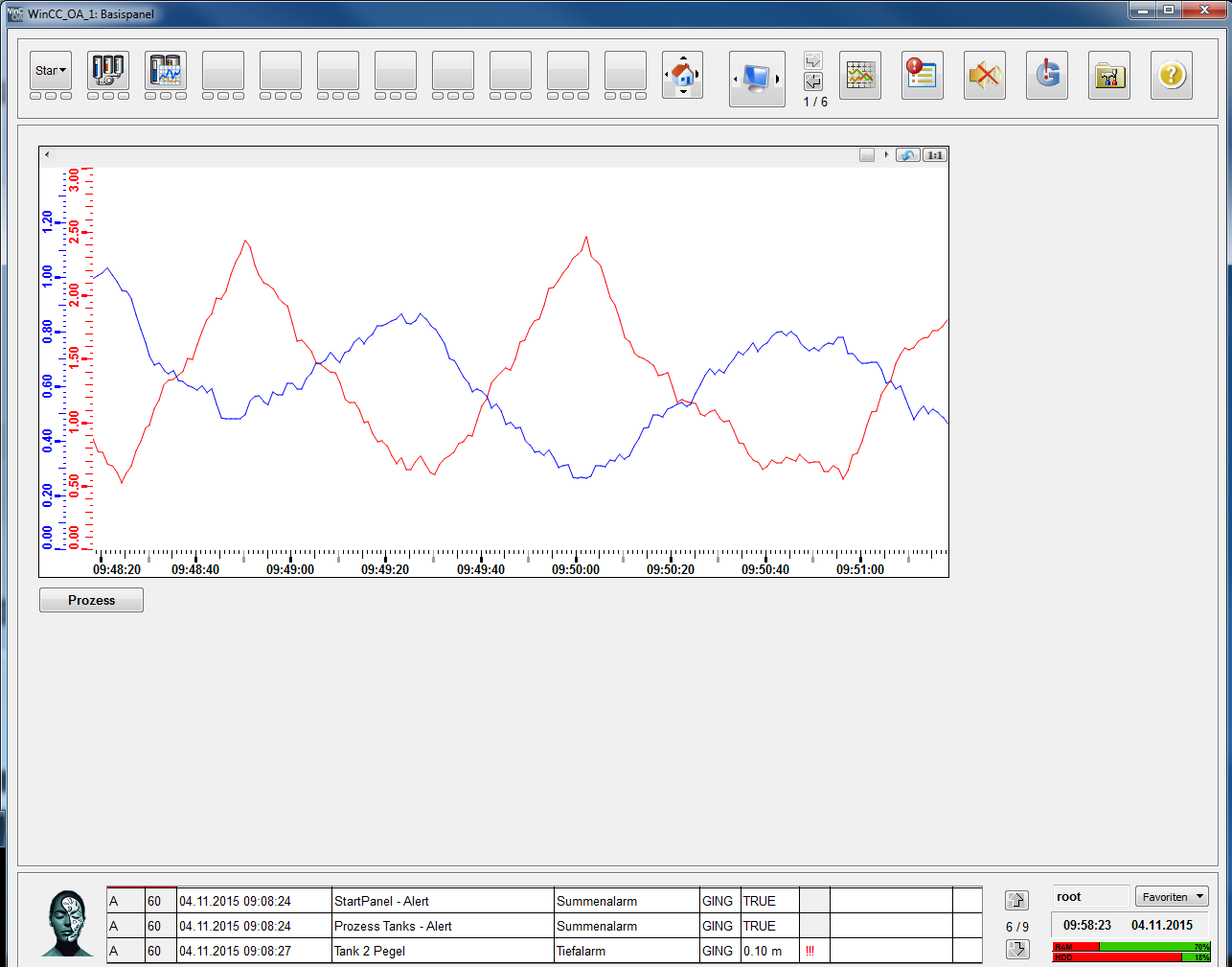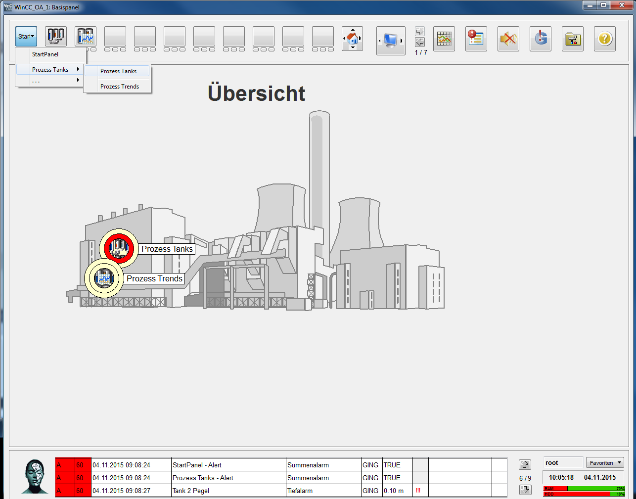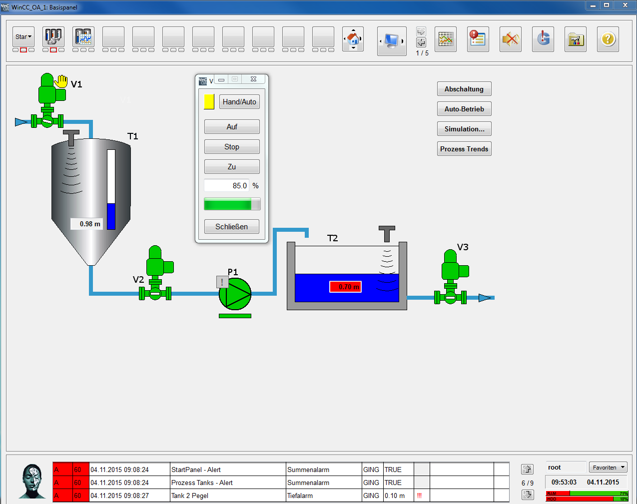 The figures of the devices as well as their operation dialogs are modeled as reusable objects in WinCC OA. The created process image should be included in a superior, flexible configurable operation image. In addition to the process image, a detailed image should show the chronological sequence of the levels in T1 and T2 also graphically (trend). An overview image should facilitate the navigation to the process image (tanks) as well as to other further parts of the plant.