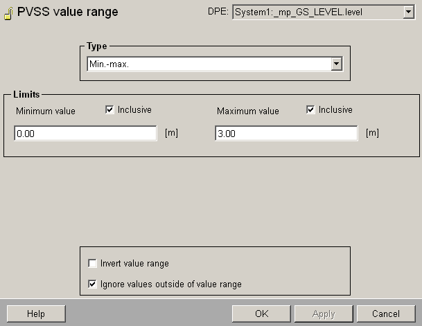 The setting "WinCC OA value range" - fixed would have meant that all .level datapoint elements of datapoint type GS_LEVEL have numerically the exact same value range. For example, this would be used for a percentage value of a flap or a standardized rotation speed.