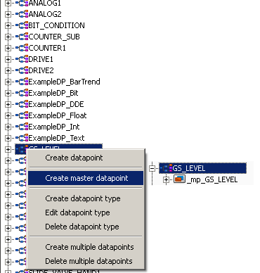 After this, select the datapoint type GS_LEVEL from the tree view and select the "Create master datapoint" entry of the context menu [rightMouseClick]. The master datapoint will now be created automatically: the naming corresponds to the data point type, however the prefix "_mp_“ (for a master data point) is added.
