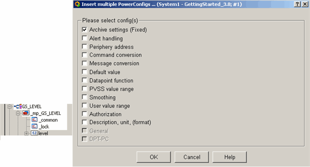 In the next step you specify a value range monitoring as well as an analog alert handling for all level measurements of the data type GS_LEVEL . Therefore, open the master datapoint and select the following configs on the leaf element _mp_GS_LEVEL.level [right mouse click] > Add PowerConfig.