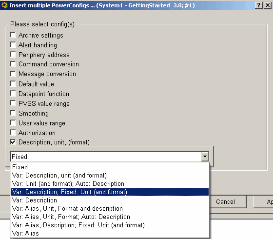 In order to set a meaningful formatting and unit for all future level measurements, add a third power config "Var: Description: Fixed: Unit (and Format)" as shown in the figures above. This means that you can configure a different description for each datapoint (for each device) but the unit and the format for the number representation will be inherited from the setting of the master datapoint.