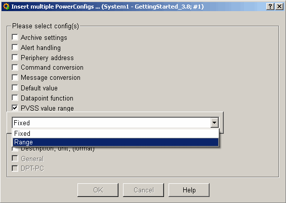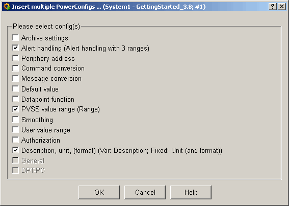 The figures above show the dialog for the power config selection after completing the settings - the selected option of the PowerConfig is shown behind the type of the PowerConfig. Confirm with OK. Confirm also the displayed hint that you have to configure these PowerConfigs subsequently.