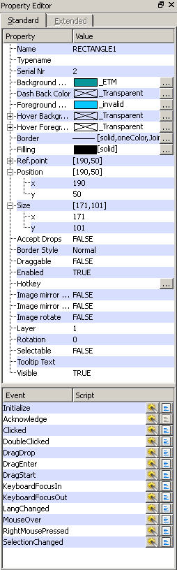 The property sheet can be opened via the menu View > Property Sheet. It displays the most important information of an object on two tabs. The second tab "Extended" is only active for complex graphic objects like slider.