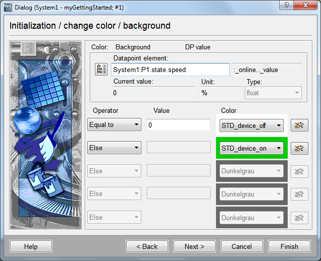 Since the graphic property "background color" and the actual value of the rotation speed should be connected, this has to be specified already at the initialization.