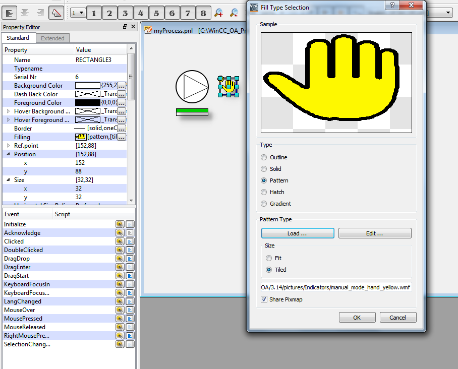 Select the option "Pattern" for the entry "Filling" in the property sheet of the rectangle and select the Installation directory in the file selection window using the combo box at the bottom of the window. If you have installed WinCC OA in the suggested directory, the selection will be C:/Siemens/Automation/WinCC_OA/<version>/pictures/.