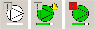 Furthermore, the alarm state should also be visualized. There are several ways to do this. One way is to use the display via a separate symbol above the pump symbol. As long as there is no alarm that should be acknowledged or that is pending, the new object will be displayed greyed out. In case of an active alarm, the graphic object will display the state color of the current alarm state.
