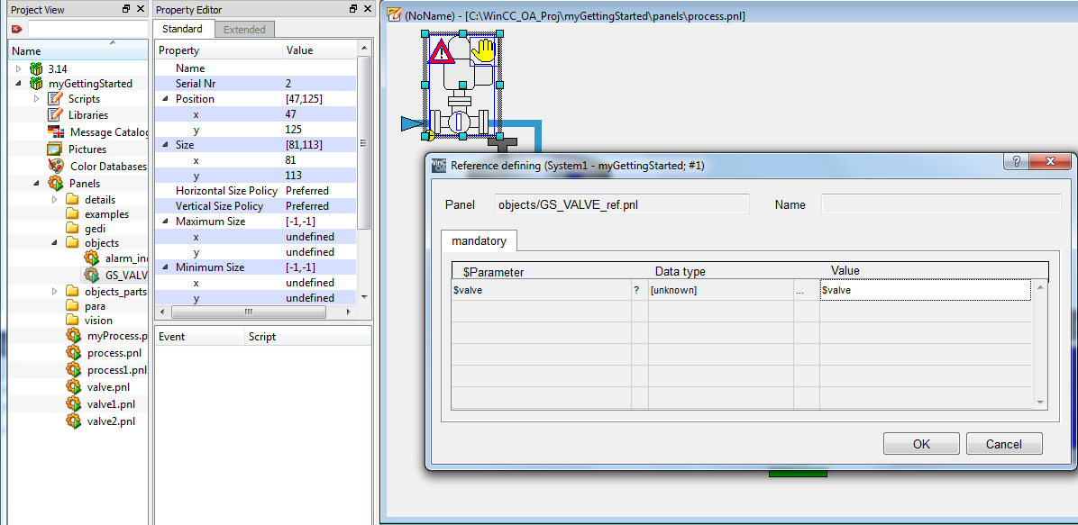 Reference panels are not mandatory restricted to an individual datapoint type (for example GS_VALVE). As long as the interface of $ parameters remains the same and the graphic display corresponds to the new use, reference objects can be created for universal use. A simple value display for arbitrary datapoint elements (bool, int, uint, float) of an arbitrary datapoint type can be a reference, as well as a whole pumping station.