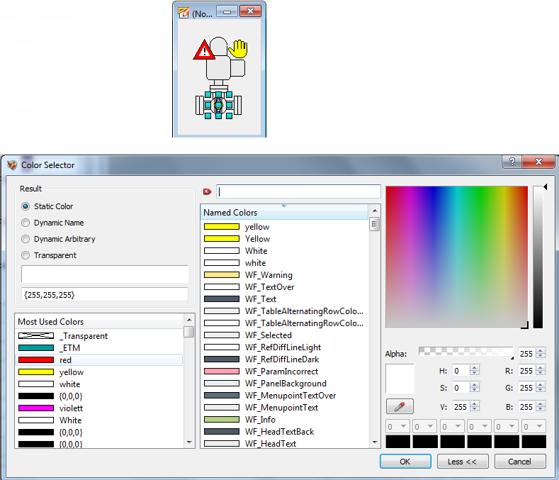 To enable the color change, the runtime system must know what colors of the colors the external graphic is based on, should be replaced. All parts of this graphic that were drawn in the specified color can be addressed in the same way as the background color of a WinCC OA graphic object.