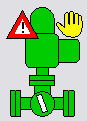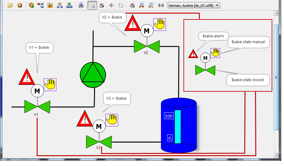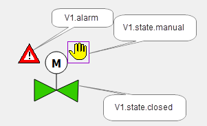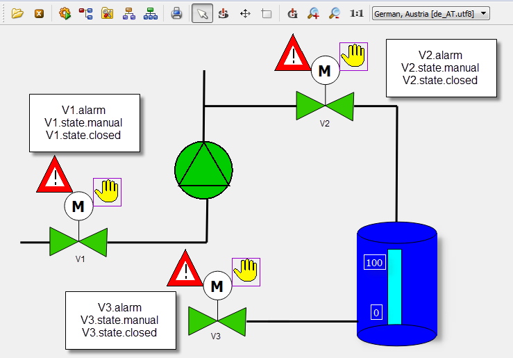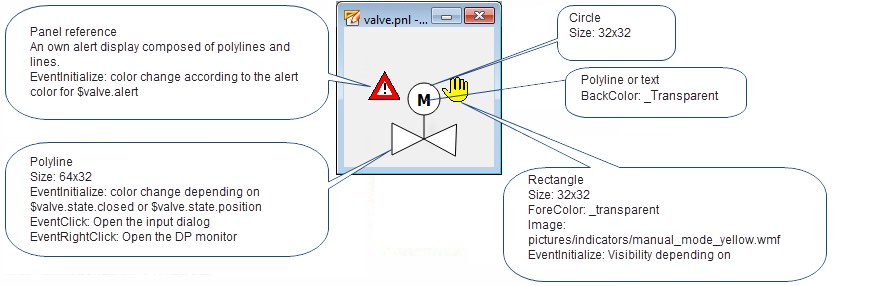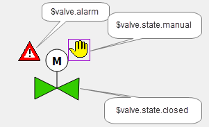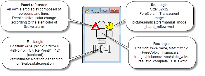 The above figure shows a technical presentation of a valve that fits to the earlier created pump symbol. You could create these easily using a polygon, a circle, a line and a polygon or a text for the character "M". The hand view is, like for the pump, a rectangle that displays a graphic. The alarm display "Reference-in-Reference" will be described first later in the chapter "Definition of an alarm handling for a datapoint".
