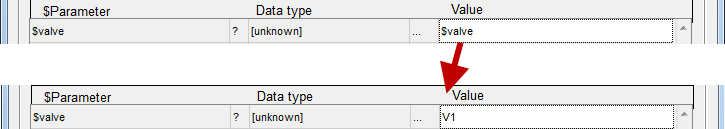 Enter the name of the first valve, for example "V1", for the "$valve" parameter (you could also choose this through click on the column with the DPE selector symbol