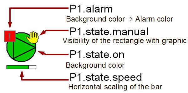 In all created dynamic objects so far, specific graphic attributes were combined with explicitly specified datapoint elements (for example background color is dependent on the element P1.state.speed). If you need several similar devices like, for example, P1, P2, P3, ... it would be wise to merge the associated graphic objects to a group, copy it several times and to position them.