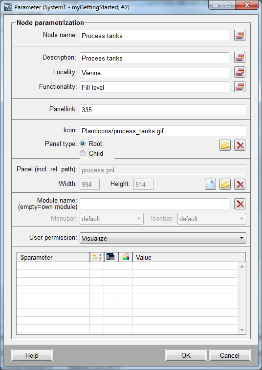 - Optionally enter a description, locality, functionality of the node (here "Process tanks", "Vienna", "Fill level").