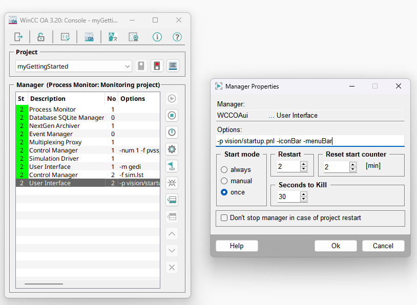 Some settings will be passed to this manager already when it is started so that the application will be opened at the desired position (panel) without any user interaction. Additionally, the menu bar and the icon bar of the user interface module should be hidden. You can do this using the GEDI menu option Tools -> Start RunTime (<project_name>) or the call parameters: