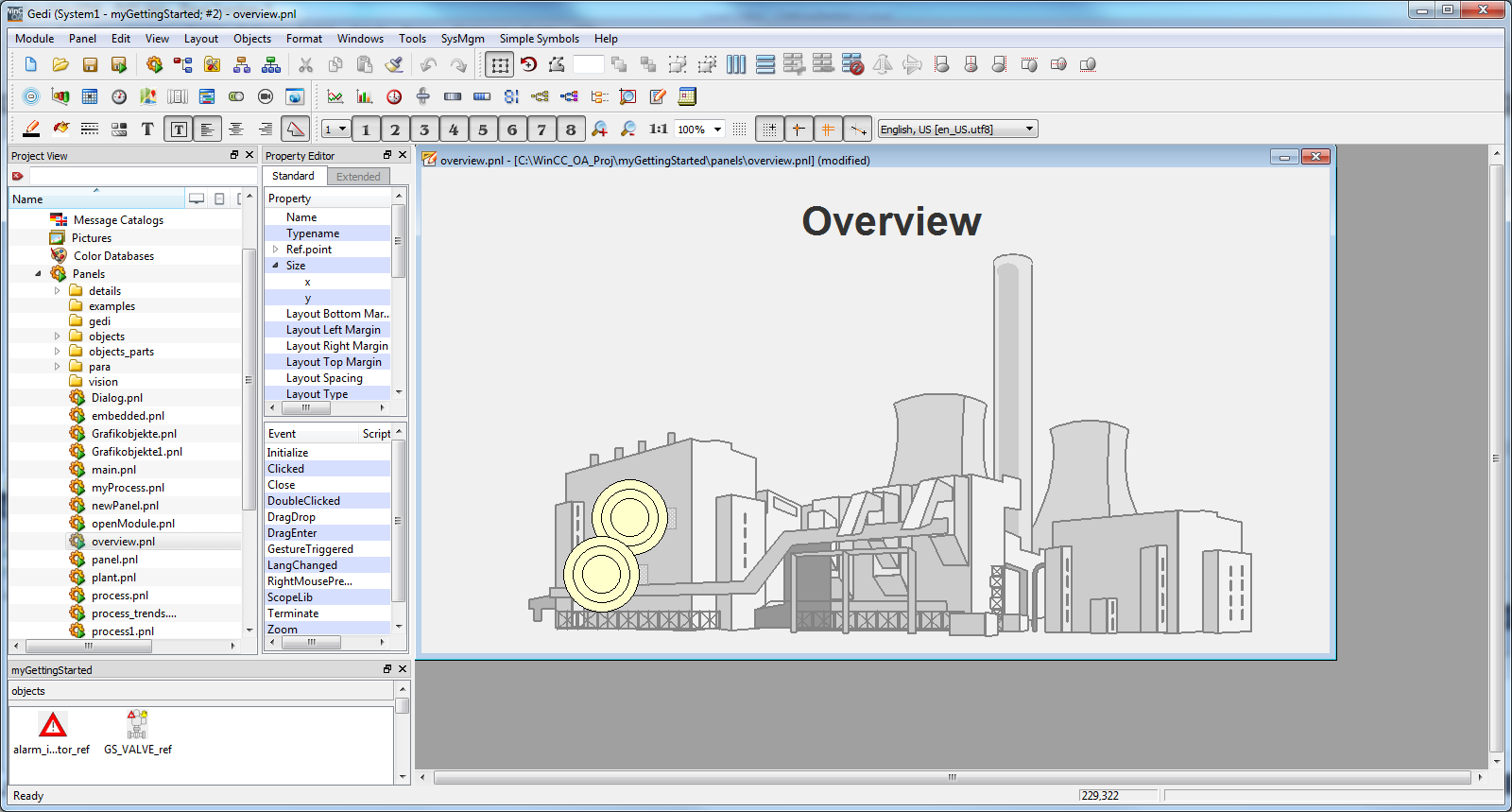 You could use the panel topology already with the settings set so far. Since in real applications an overview image is used to access the navigation and alarm view for all plant components, you will also create an overview image (see also the last figure on this page).