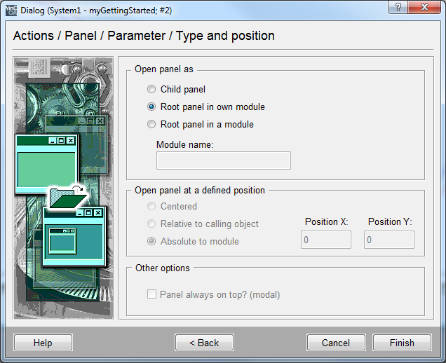 Activate the option "Root panel in own module". A module name is not specified and the desired panel will be opened in the current module. Close by selecting Finish.
