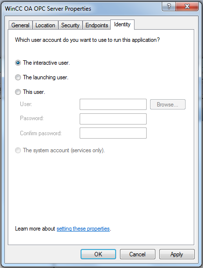 If you connect a remote OPC server, which is running on another computer, through DCOM to a client, connection problems may be caused by security settings of the operating system. Contact your system administrator to check or change the settings.