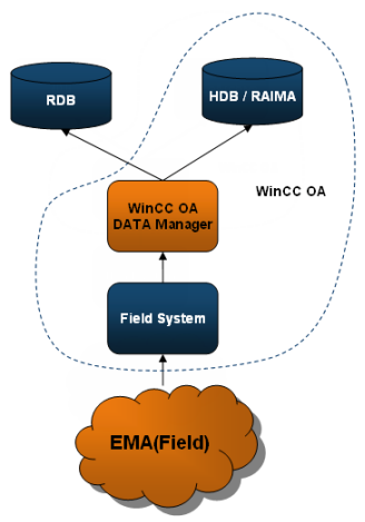The configuration has the benefit that in case of losing the connection between field system and RDB, the value changes are still archived in the HDB of the field system and will not be lost. The local historical data could also be accessed when directly working on the field system without active connection to the central Oracle DB.