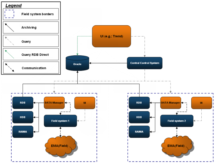 Each field system can be configured to archive the data to the central RDB (in the control system scope) and to the local history database (HDB) respectively alert database (RAIMA) at the same time (see Configuration of HDB - RDB Parallel and Configuration of Alert Archiving Parallel (RAIMA - RDB)). The UI at the control system can access data directly from the RDB or from the HDB/RAIMA (field system, when a distributed system is configured and the connection is established) depending on the configuration using the config entry queryRDBdirect.