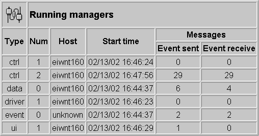 Displays all currently active managers with manager number, host name where the manager runs, starting time and number of telegrams sent to and from the Event Manager (see WinCC OA diagnostics and Diagnostics panels. Edit an Update time for the connections in the latter panel, otherwise no messages will be displayed).