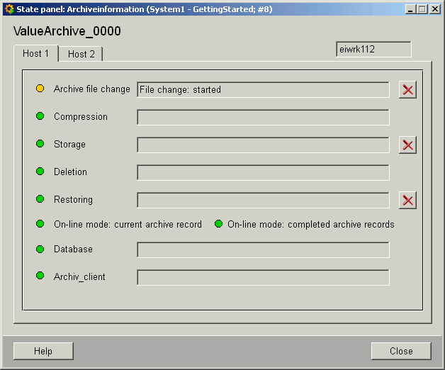 This panel provides information about the status of individual actions. Messages of current processes are shown in the text fields. The bullets also provide status information by changing their color (green = "everything OK", yellow = "busy" and red = "an error has occurred"). The Host 2 tab is only active and visible with redundant systems.