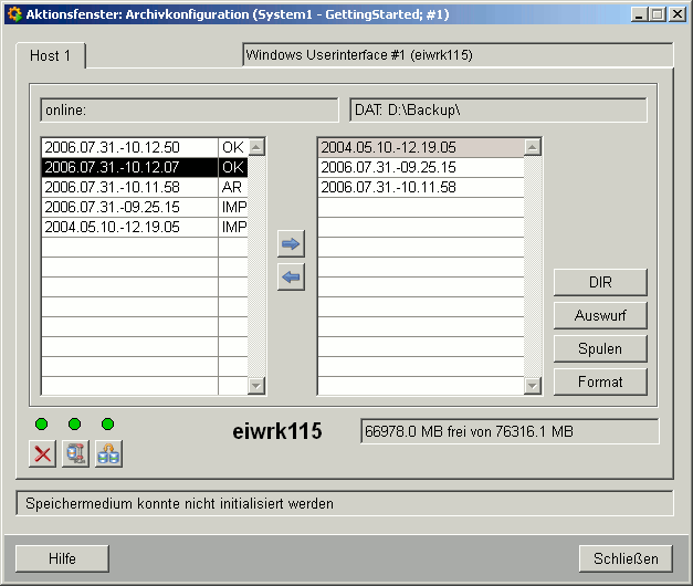 - The swapped out archive records are entered in the right field, after clicking on DIR. During swap-out, a message ("Waiting for release of DB" and "Files are being written") is shown in the status bar.