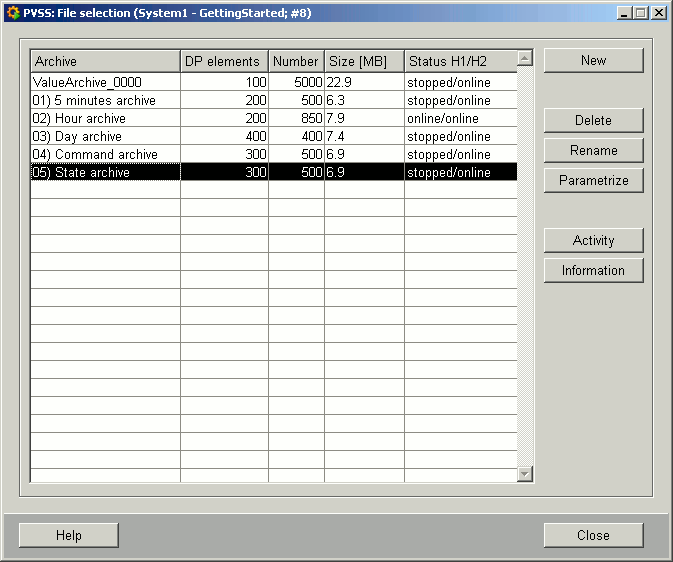 - Num: The amount of datapoints of the total number of datapoints. The first figure is the amount of the active datapoints that have been assigned to an archive (active datapoint means that you have selected the check box Store original value in the archiving config for the data point). The second figure is the number of datapoints that are currently archived and the third figure represents the maximum number of datapoints that can be archived in the current archive. The number 4(4)/100 means, for example, that 4 archive sets have been assigned to the archive, 4 are currently archived and a maximum of 100 datapoints can be archived in this archive.