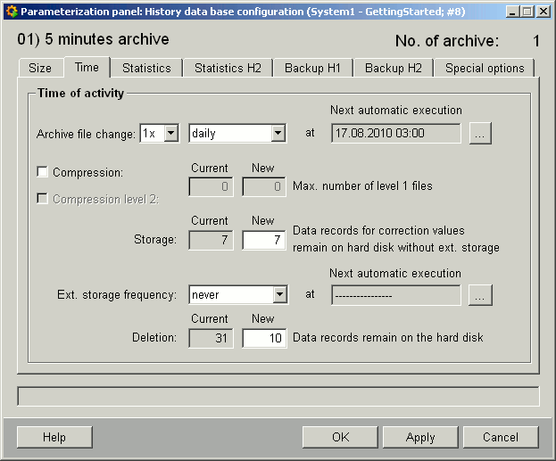 In this tab, you define the parameters for the open time of archives, the compression time offset and so on.