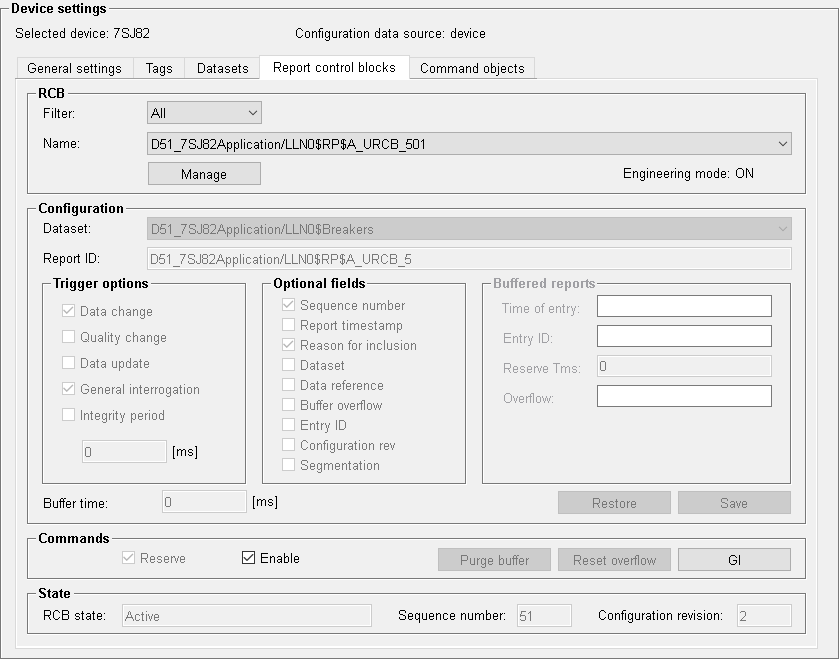 The Report control blocks tab is used for managing the report control blocks available in the device.