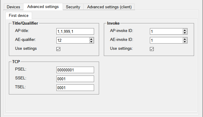 This panel allows to configure advanced server parameters. By default, only the tab for the first device is shown, the tab for the second device is only displayed if the option "redundant device" is enabled.