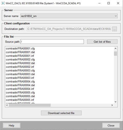 File Transfer is used to download files from an IEC 61850 server. The file transfer function, as implemented by the WinCC OA client, uses MMS services and is format independent, i.e. it can handle any format used by the server.