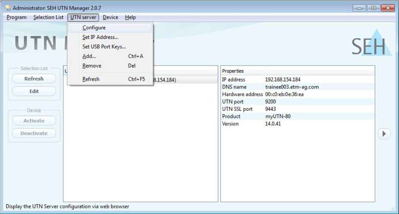 Now the device can be activated to be used by a client. Therefore select the device inside the UTN Manager, open the menu point “Devices” and click on “Activate”.