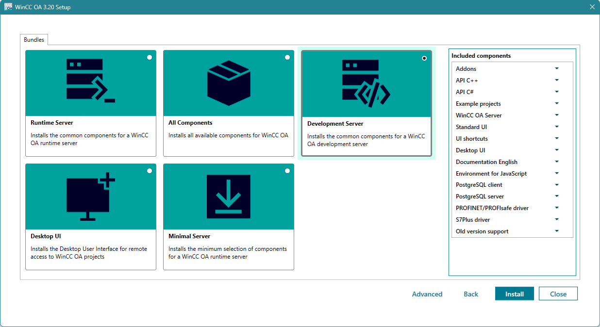 - Select one of the bundles for installation. The components included in the bundle are displayed in the list on the left. An explanation for the component can be accessed via the drop down. An overview of the bundles and their components can be found here and a concise description for the components can be found here.