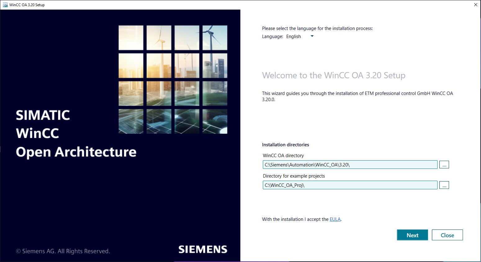 DemoApplication and GettingStarted projects (applications). By default WinCC OA is installed in the C:\Siemens\Automation\WinCC_OA\3.20\ directory. The projects are installed under C:\WinCC_OA_Proj\ by default.