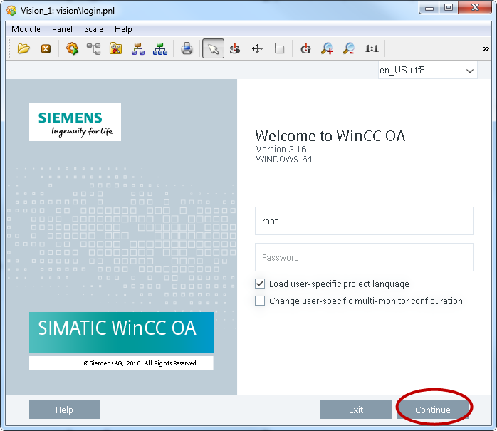 In the login.pnl the "btn_action" button opens another child panel, either the "System use notification" if it was activated or a vision panel. For projects the first panel is usually a top-level diagram or control diagram of the system. The panel topology can be used to open the panels in the desired order, see panel topology for more information.