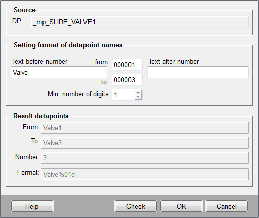 The format of the datapoint names is defined here. Characters making up the names of the generated datapoints can be entered in the text field Text before number and Text after number. The fields from:/to: contain numerical values defining how many datapoints shall be created (for example, Pump_1 to Pump_50). The spin-button Min. number of digits can finally be set to specify the number of digits (default 1) for the numerical values (for example, min. number of digits = 3, format would be 001).