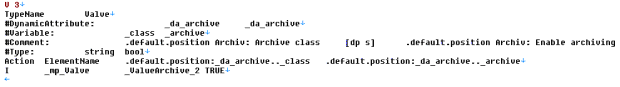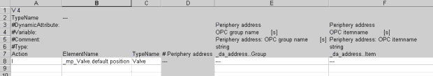 The format (V 4) is in the 1.line / 1.column. The ”r;TypeName” is in the 2.line/1.column. In this template the dynamic attributes of single datapoint elements at master data point are divided into columns (all the PowerConfigs used in the project with dynamic attributes are taken into account when exporting and the smallest common denominator consequently builds the number of columns in the file, i.e. the file never contains more columns than the number of available dynamic attributes in the project.) The structure is built up per line which means that a datapoint element is displayed per line. Since there can be several datapoint types in the file in format V 4, the right membership of different datapoint elements is displayed via the ”r;TypeName” column. In the figure above a template of datapoint type Valve was created with the same configuration (PowerConfig ”r;Archiving” with the dynamic attributes ”r;_class” and ”r;_archive”) as it was used when exporting in V 3 (see above).