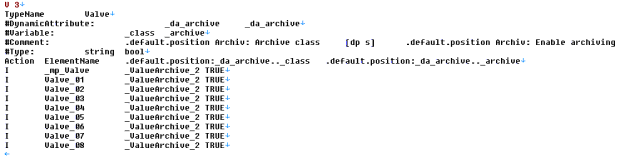 In this example, a number of datapoints have already been created in the system and incorporated when the DP list was exported. All the datapoints and the defined dynamic attributes are clearly displayed in the ASCII file, and you can make any value settings immediately and/or save this file and use it for making subsequent changes to the dynamic attributes.