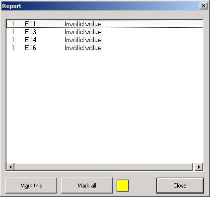 In the figure shown, 4 illegal entries were found in the table. You can see the concerned cell in the protocol as well as a description of the error. Via selecting an entry in the error protocol and clicking on the button Mark this, the cell with the error is defined with a color (for example, yellow) . Which color is used for the marking, depends on made settings in the dialog window (see dialog window Options). The button Mark all marks all cells that contain an illegal value, with the defined color.