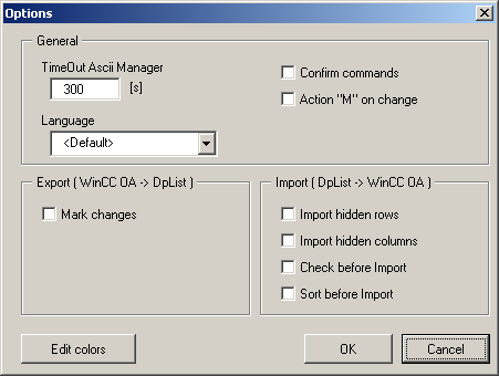 In the General section you can set the time-out time in seconds for the ASCII Manager. If the ASCII Manager runs for a longer time without importing/exporting data (longer than the specified time), the user receives a dialog, which conveys the time-out and no answer from the ASCII Manager was sent (In that case control running processes, because the ASCII Manager does not stop automatically after the defined time). In addition, you can change the language settings for the menu and the dialog boxes used in the Language combo box.