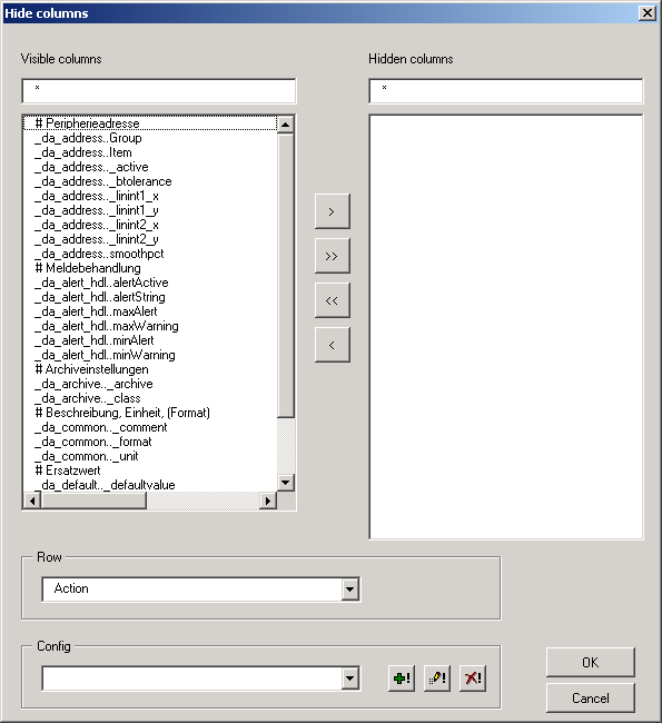 Opens a dialog window in which you can select the columns that are to be hidden in the Excel sheet. Hiding a column (a column corresponds to a dynamic attribute) means that it is not included in the import into the internal database. If you have already defined a filter for the DP list (see option Filter columns), then you can save this definition as a configuration in this dialog box. The dialog window shows immediately when opened which columns are shown or hidden.