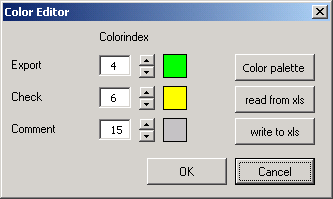 After changing the colors, the current color settings can be transferred to the opened Excel sheet via the write to xls button (in order to see this also in the sheet, you have to change the color for the Export, Check or Comment). The set colors are administered in a separate color catalog in the Add-In. Via opening another sheet where other color settings were set, a transfer of the color palette between the current sheet and the Add-In is initiated via clicking on the read from xls button.