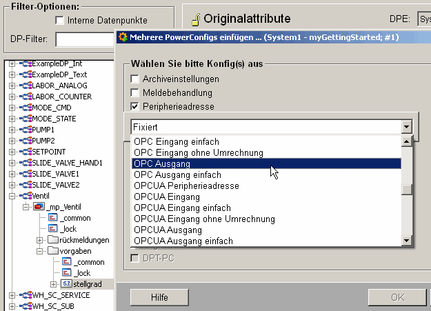 This page shows you how to use a PowerConfig and apply configuration to multiple data points. An OPC interface allowing communication between WinCC OA and peripheral equipment might be a possible application for using PowerConfigs for rapid generation of the correct peripherals address for large numbers of datapoints. Of course one must make sure that the correct symbols are used when programming the PLC.
