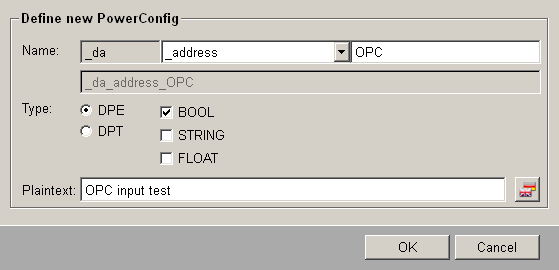 powerconfigfile (you can find more information on the structure of this file on the page Structure of the powerconfig file). The script for this example should look as follows:definition32() { // definition start //_da_address_OPC:BOOL // variables definition string Server; string Group; string Item; string _reference="$$_mp_"+dpTypeName($DPE)+"_OPCITEM"; bool _active; string _drv_ident="OPCCLIENT"; int _direction; // dpGet dpGet($DPE+":_address.._reference",_reference, $DPE+":_address.._active",_active, $DPE+":_address.._drv_ident",_drv_ident, $DPE+":_address.._direction",_direction); // calculate input Server = substr(_reference, 0, strpos(_reference, "$")); _reference = substr(_reference, strpos(_reference, "$")+1, strlen(_reference)); Group = substr(_reference, 0, strpos(_reference, "$")); Item = substr(_reference, strpos(_reference, "$")+1, strlen(_reference)); // variables input //Server //Group //Item //_active // calculate output _reference = Server+"$"+Group+"$"+Item; // dpSet dpSetWait($DPE+":_address.._drv_ident",_drv_ident, $DPE+":_address.._reference",_reference, $DPE+":_address.._direction",_direction, $DPE+":_address.._active",_active); err = getLastError(); if (dynlen(err) > 0) { throwError(err); } // default dpSet($DPE+":_address.._reference", _reference, $DPE+":_address.._active",FALSE, $DPE+":_address.._direction", "\2", $DPE+":_address.._drv_ident",_drv_ident); // definition end } - After the PowerConfig was created, the GEDI has to be restarted in order that the new PowerConfig will be available/visible.