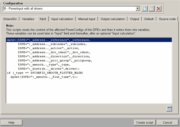 In this tab you define a script that reads the current values of the DPE for which the PowerConfig has been configured, and writes these to variables. The values are ultimately displayed in the panel for PowerConfig configuration (see PowerConfig configuration at the datapoint). An optional input calculation can be applied to the values before display (i.e. a script for calculating the value is run before displaying the current values - see also Input calculation tab).